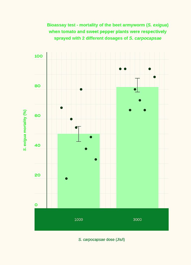 Beneficial nematodes control caterpillars effectively. Depending on circumstances at spraying, spraying technique and caterpillar species, an efficacy of 50 to 80% can be achieved.
