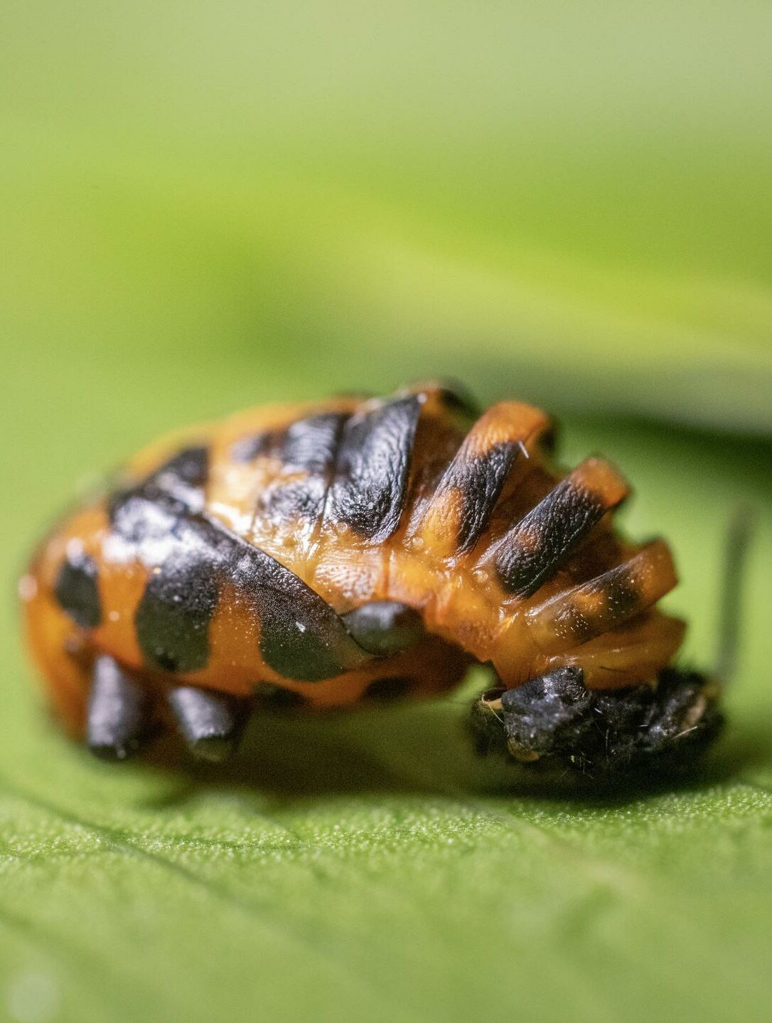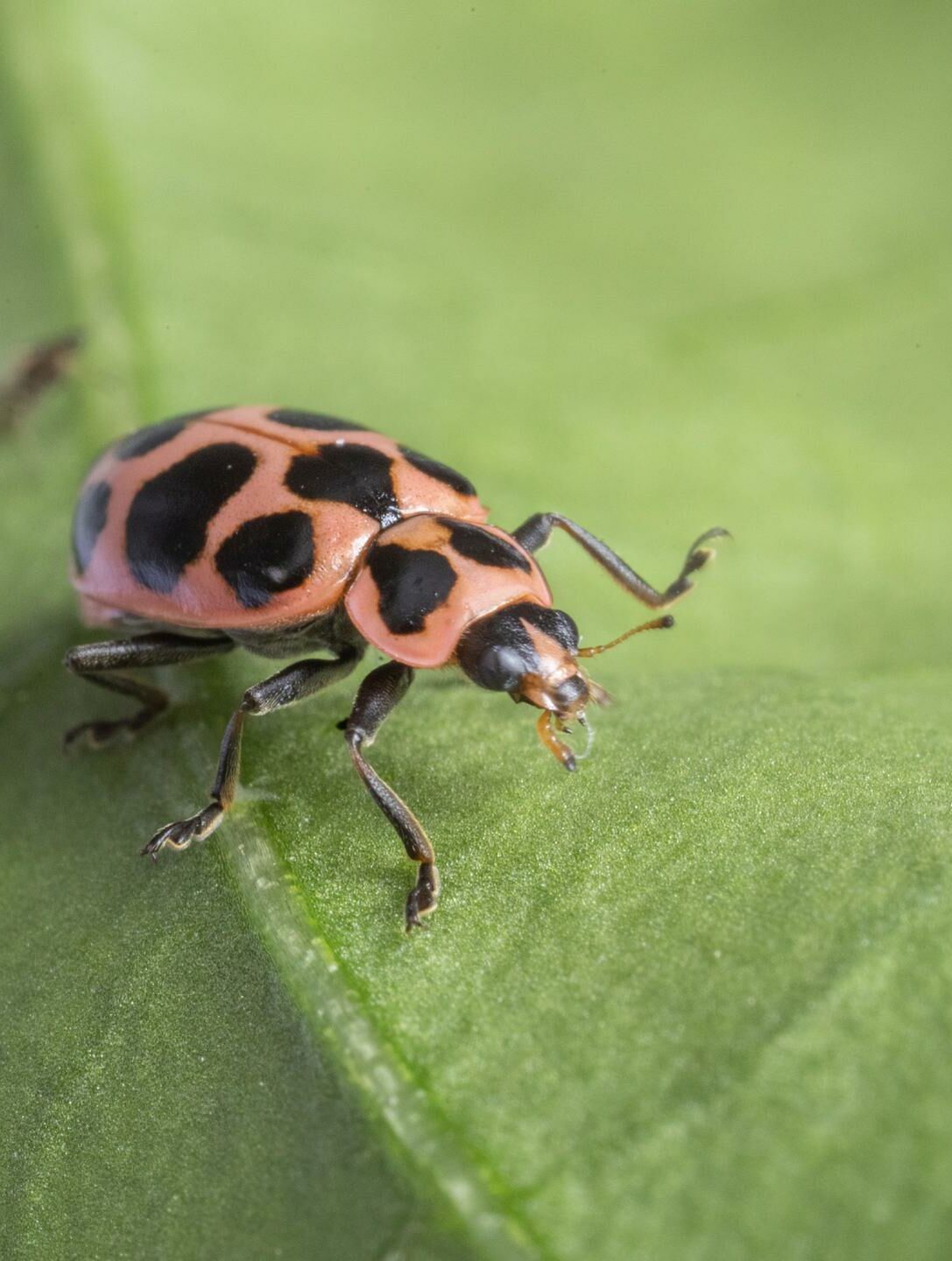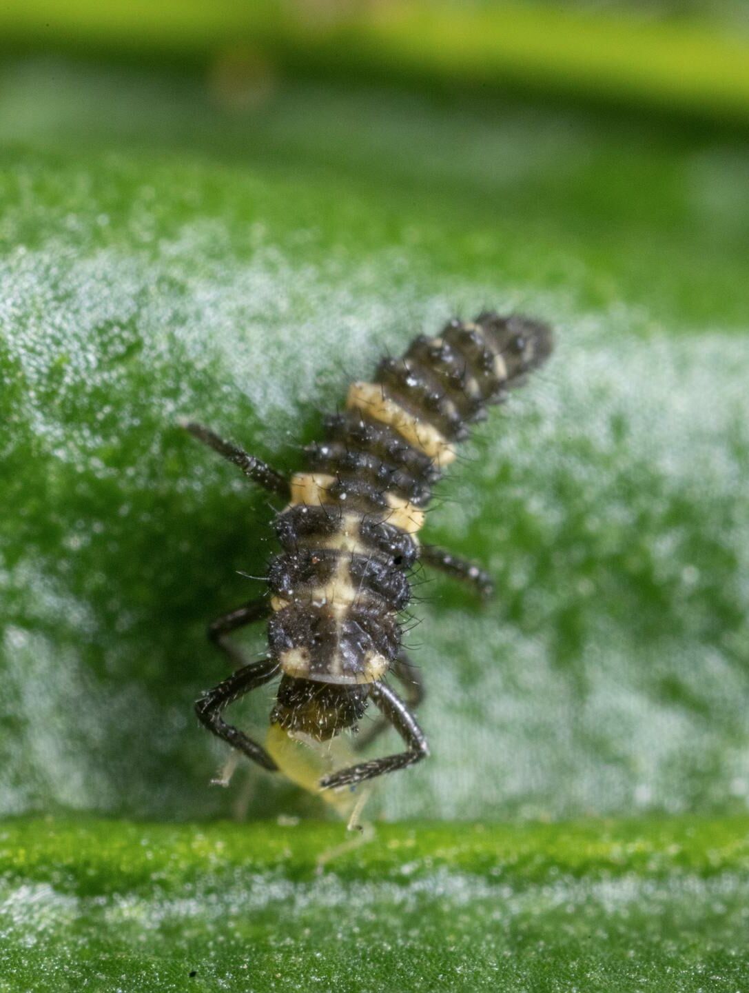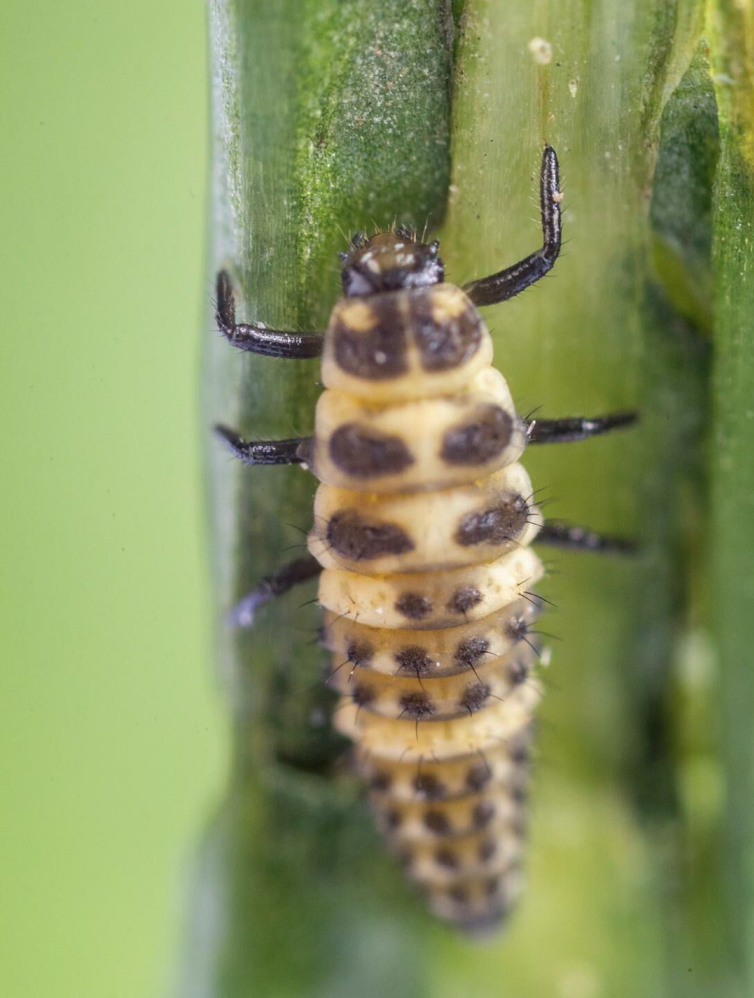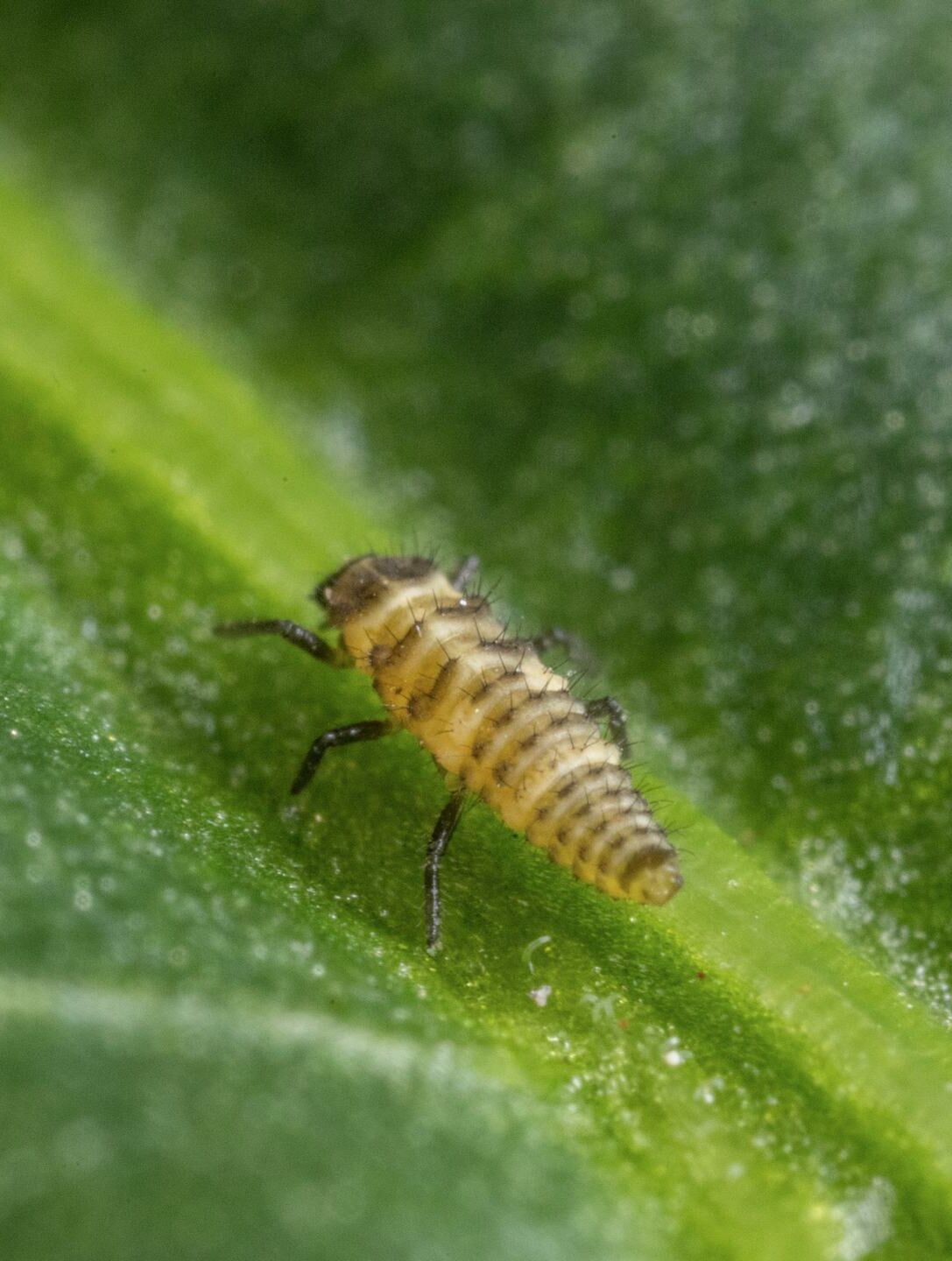 C. maculata larvae are very active and quickly disperse among the crop leaves.