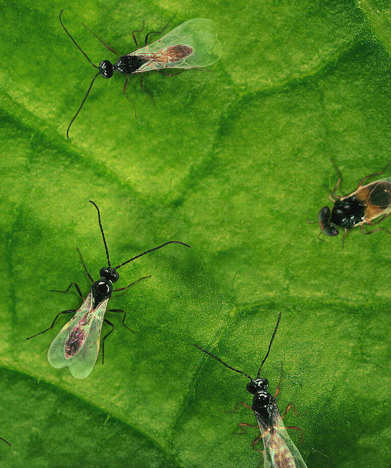 Aphids are notorious for infesting a wide range of crops and causing damage by sucking plant sap and transmitting plant viruses. Parasitic wasps, such as Aphelinus abdominalis (Aphilin), Aphidius colemani (Aphipar), Aphidius matricariae (Aphipar-M), Aphidius ervi (Ervipar) and Praon volucre, Ephedrus cerasicola (Aphiscout) are particularly effective in controlling aphid populations.