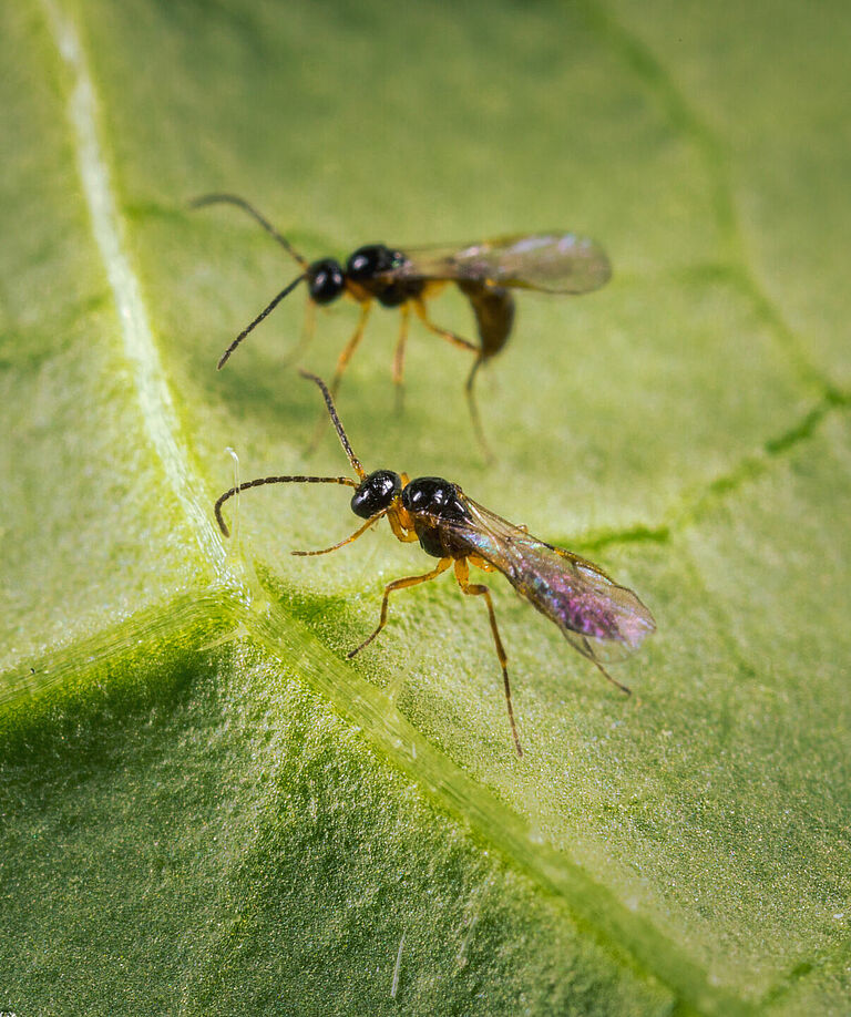Aphidius colemani has a very effective searching behaviour, which enables the wasps to track down and parasitize aphids, even when they are at low density. The behaviour of the female during egg-laying is typical of the Aphidiidae. First the host is examined by drumming with the antennae. This gives the wasp the information about whether the aphid is the right species, and whether it has not been parasitized before. If both criteria are met, then the second phase of parasitization will start. The female stands on outstretched legs and bends her abdomen forward beneath the thorax and between her legs. By moving her abdomen forward, she pierces the aphid with her ovipositor and deposits an egg. All this happens in less than half a second. Apart from the parasitization itself, the disturbance of the aphid population by the presence of the parasitic wasp also has an effect: the alarmed aphids secrete a warning substance, which affects the entire population, often causing aphids to drop from the leaf and fall to the ground. Although many aphids die as a result, many will survive and migrate to other plants to begin new colonies. To avoid becoming covered in their secretions, the parasite will not readily enter very dense aphid colonies.