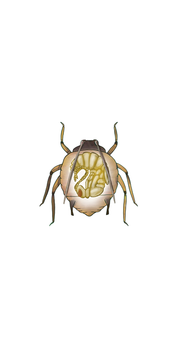 Aphidius ervi is a very dark aphid parasitoid. The waist is entirely black, without striping. As it can develop in large aphid species they are generally much larger than Aphidius colemani or Aphidius matricariae. However, if Myzus spp. is their host, they will be of the same size. The parasitization behaviour resembles Aphidius colemani, however, Aphidius ervi is more aggressive and can even pursue the aphid to parasitize. Because of this, the disturbance of aphid colonies can have a serious impact. The aphids can be spread through the crop, and it has been shown that mortality rates among aphids due to disturbance by parasitoids can be very high. A parasitised aphid will turn into a leathery, golden brown mummy.