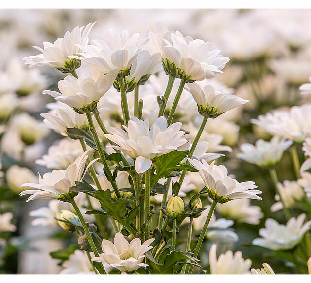 The chrysanthemum (Chrysanthemum spp. ), also called mum or chrysanth, is a flowering plant that belongs to the genus Chrysanthemum of the family of Asteraceae. The plant is originally from Asia and northeastern Europe and the majority of the different species derive from East Asia. Especially in China a wide range of varieties and cultivars has been developed for commercial propagation and production. The current, commercially cultivated chrysanthemums are more striking than the wild varieties. The flower heads can look like daisies or pompoms or buttons. This particular genus consists of many hybrids and an extensive range of cultivars that are produced for commercial, horticultural purposes. Traditionally, yellow is the main colour of this flowering plant. Nowadays, a wide range of other colours is available such as white, purple and red.