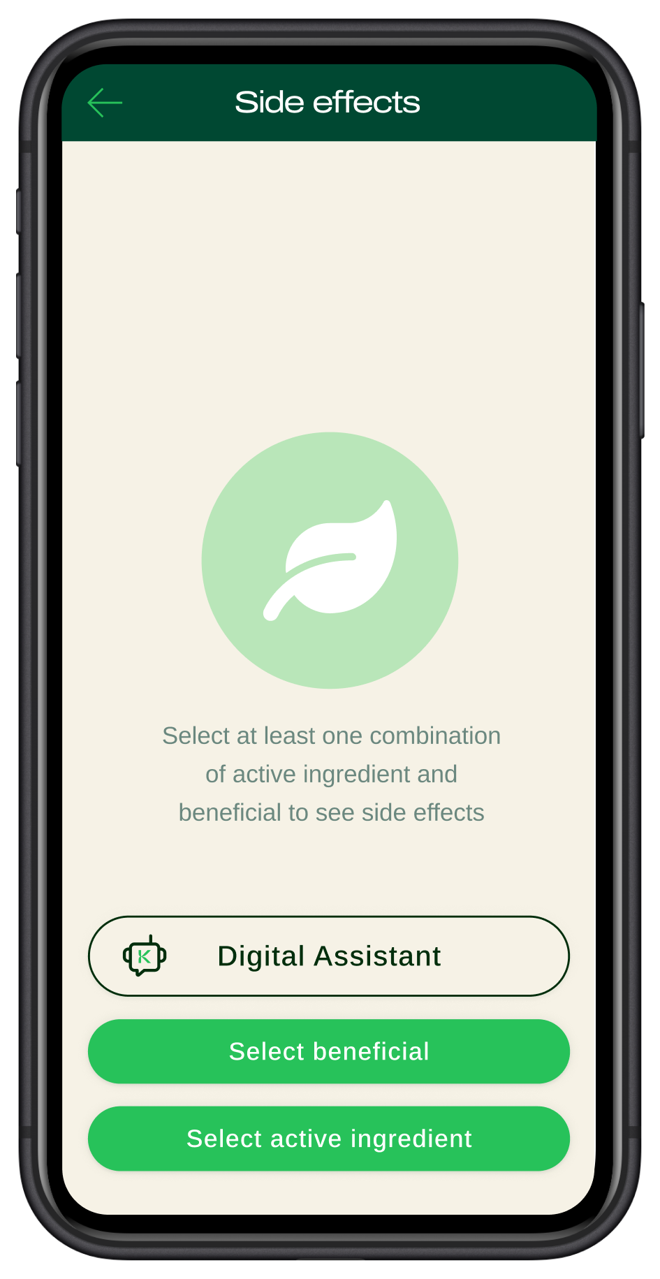 Koppert One Side Effects offers two convenient ways to access information: use the app's standard search feature or consult the Digital Assistant for advice. Simply ask any questions related to side effects and receive prompt, accurate answers to support informed decision-making. This advanced capability, combined with an user-friendly design, provides flexibility and allows you to choose your preferred method for retrieving information.