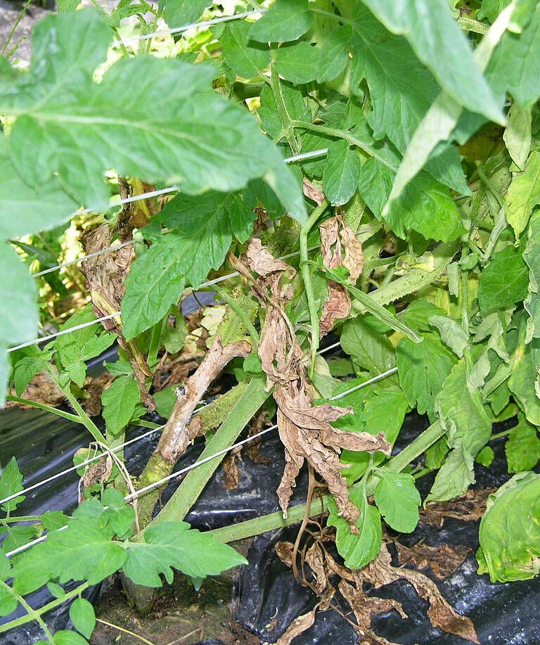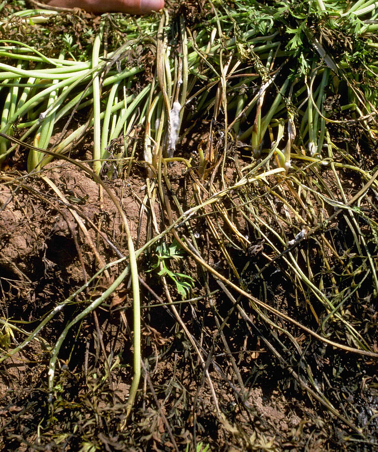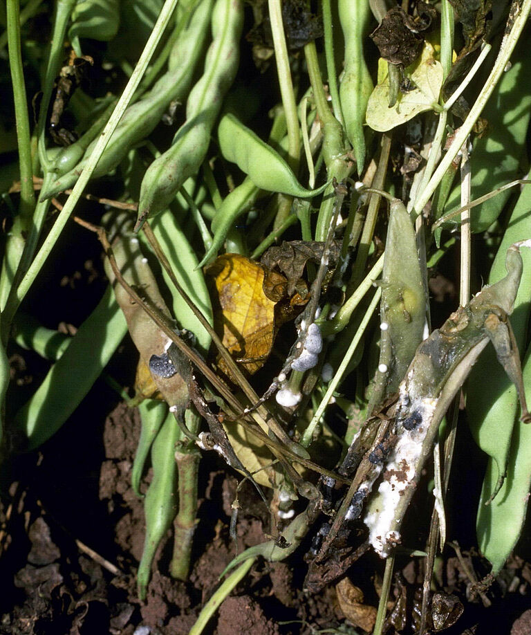 The first symptoms of a cottony soft root (Sclerotinia sclerotiorum) infection are water-soaked lesions at the stem base. The plant above it wilts and rots. White, fluffy fungal mycelium grows on the lesions, giving this disease its name cottony soft rot. In the mycelium, big, dark sclerotia are formed. They can easily be seen with the naked eye and look like rat droppings. The symptoms may occur on stems but also on leaves, fruits and pods.