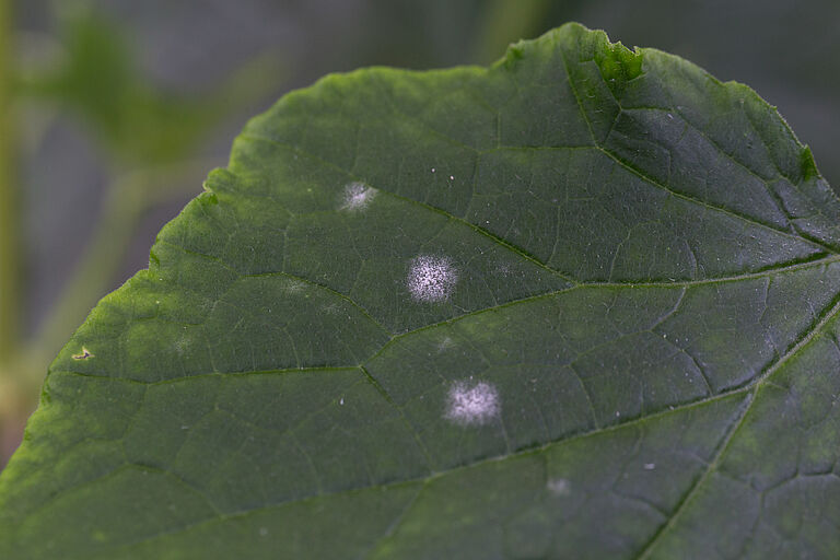 In pepper, the fluffy colonies occur mostly on the underside of the leaf, because the fungus infects the plant by entering through the stomata and there are more stomata on the underside of the leaf. On the upper side, yellow spots are noticeable. In case of a severe epidemic, the fluffy colonies also appear on the upper side of the leaves. Many sweet pepper cultivars react to powdery mildew infection by dropping leaves that are not infected yet. It depends on the cultivar how soon after infection this happens.