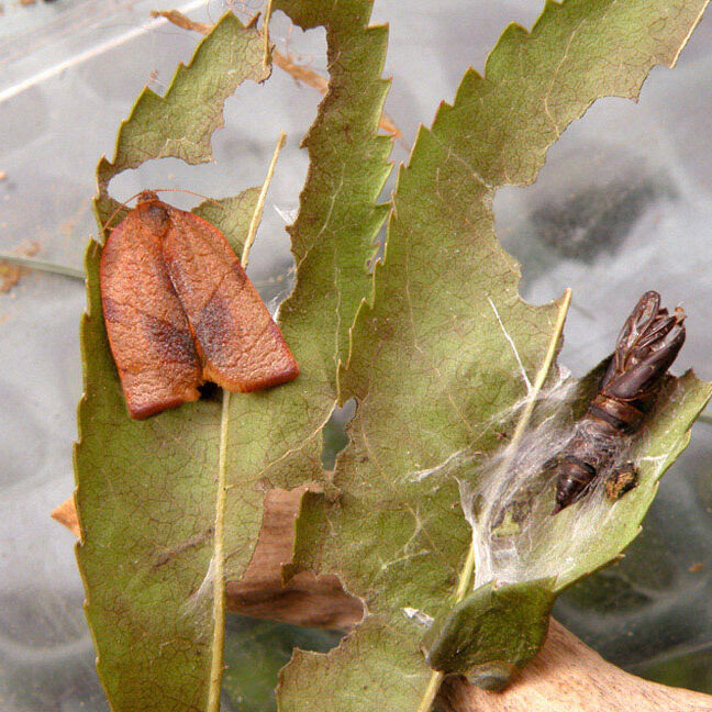 The larvae of the carnation tortrix (Cacoecimorpha pronubana) feed on the upper surface, thereby producing holes. Finally, at the third larval instar, the whole leaf is attacked and surrounded by a dense silken mass. The larvae hide inside the rolled leaves, growing tips or flowers that have been spun together.