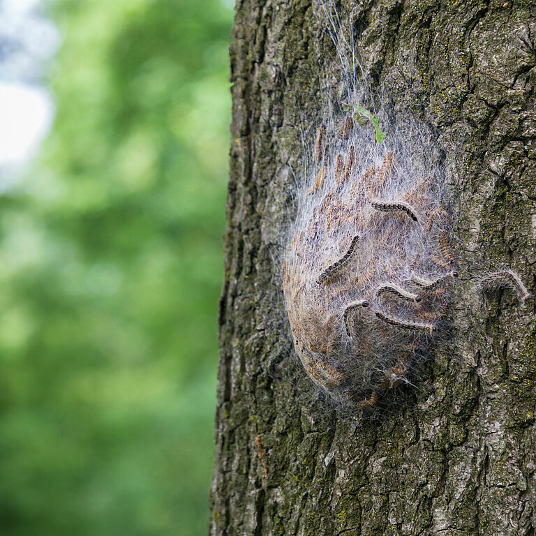 The first instar larvae overwinter within the eggs and hatch in mid- or late April. They are nocturnal and feed gregariously. The newly emerged larvae are brown. In later instars, their body becomes grey. From the third instar onwards, each larva starts producing thousands of very small, barbed urticating hairs (ca. 0.1 mm). These hairs contain an allergenic protein, thaumetopoein; which can be actively released in the air when the larvae are disturbed. After moulting, the previous stage's hairs remain on the exuvia, but can become airborne and are still allergenic. In dry weather, these urticating hairs can remain allergenic for months. From the 5th instar on, the larvae start building silken nests at the base of lower branches, on the trunks or at the base of the trunks, which may contain thousands of individuals. The larvae usually stay in their nests during the day leaving at night in a characteristic procession to feed in the canopy of the trees. If the leaves on a tree become scarce, the larvae move away from the tree collectively to colonise another host nearby. At pupation time (late June, early July), the larvae spin cocoons inside the nests.