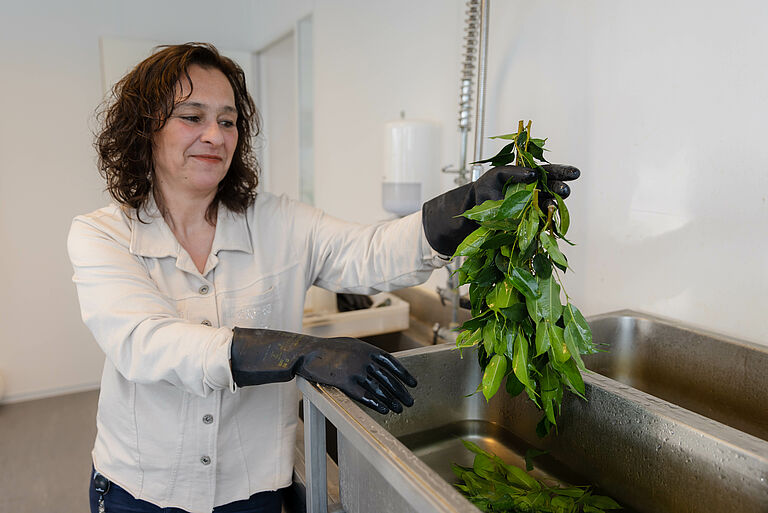 De gewasmonsters die worden onderzocht, worden aangeleverd in een emmer met vers geknipte takken uit het gewas. De takken worden eerst met heet water gespoeld om alle tripsen, roofmijten en andere insecten te doden en los te maken van het plantmateriaal. Na herhaaldelijk zeven, worden een aantal insecten en mijten getelt en geprepareerd om gedetermineerd te worden onder de microscoop.
